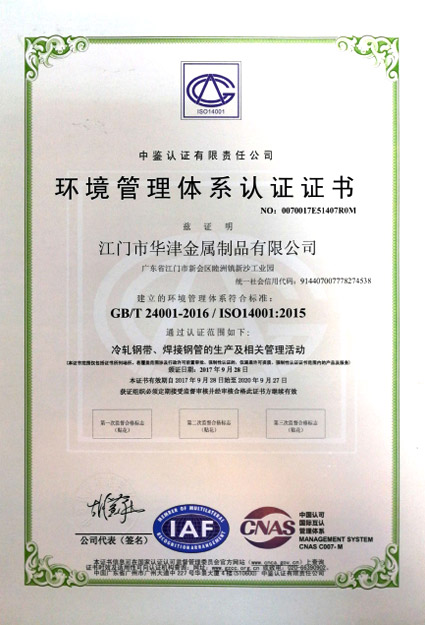 2017年9月,本公司之公司江門華津金屬制品有限公司(以下簡稱“華津”)及江門市華睦五金有限公司(以下簡稱“華睦”)分別收到由中鑒認證有限責任公司所頒發的《環境管理體系認證證書》(證書編號分別為:0070017E51407R0M號及0070017E51413R0M號)。